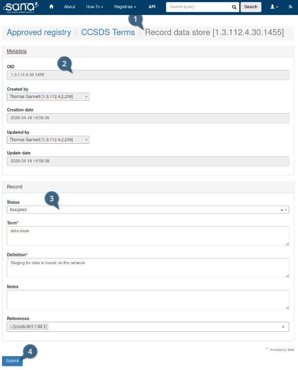 When a change to an existing registry is requested to SANA, the following information should be included in the CCSDS standards track document. The change may be adding new entries in the registry or a change in the structure of the registry. If a change in the structure of the registry is required, the SANA Considerations section should contain the same information needed to create a new registry, such as data types, boundaries, registration rule, etc.
